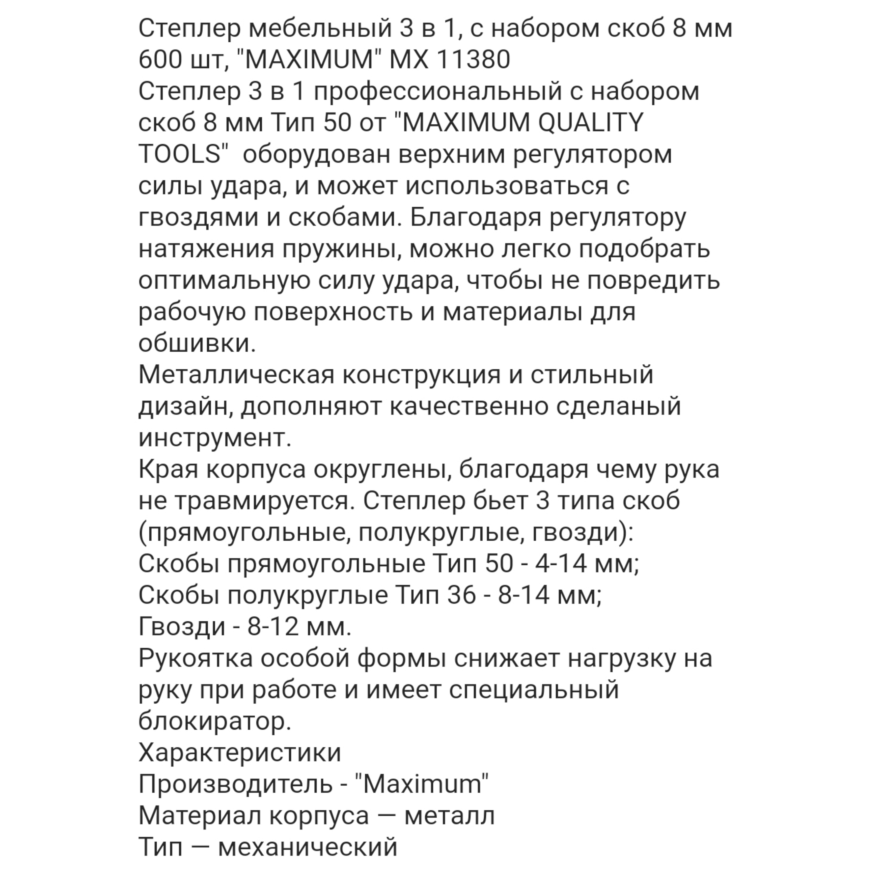 Степлер 3 в 1 профессиональный с набором скоб 8 мм Тип 50 от "MAXIMUM QUALITY TOOLS" оборудован верхним регулятором силы удара, и может использоваться с гвоздями и скобами. Благодаря регулятору натяжения пружины, можно легко подобрать оптимальную силу удара, чтобы не повредить рабочую поверхность и материалы для обшивки.
