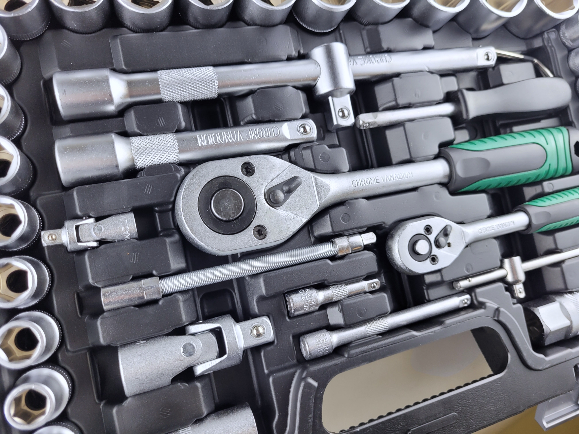 Набор инструментов для авто 94 предмета имеет в комплекте ключи-трещотки с обратным реверсом и удобными двухкомпонентными рукоятками. Поставляется профессиональный набор инструментов в удобном, закрывающемся кейсе для надежного хранения и транспортировки.