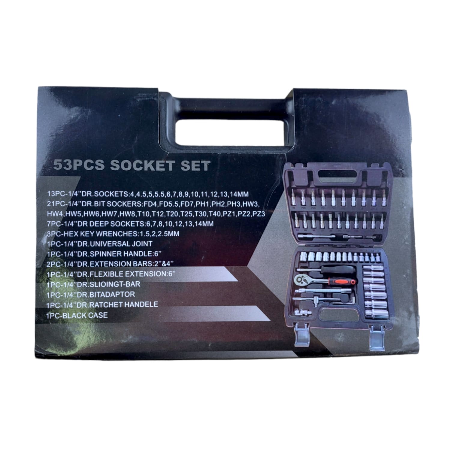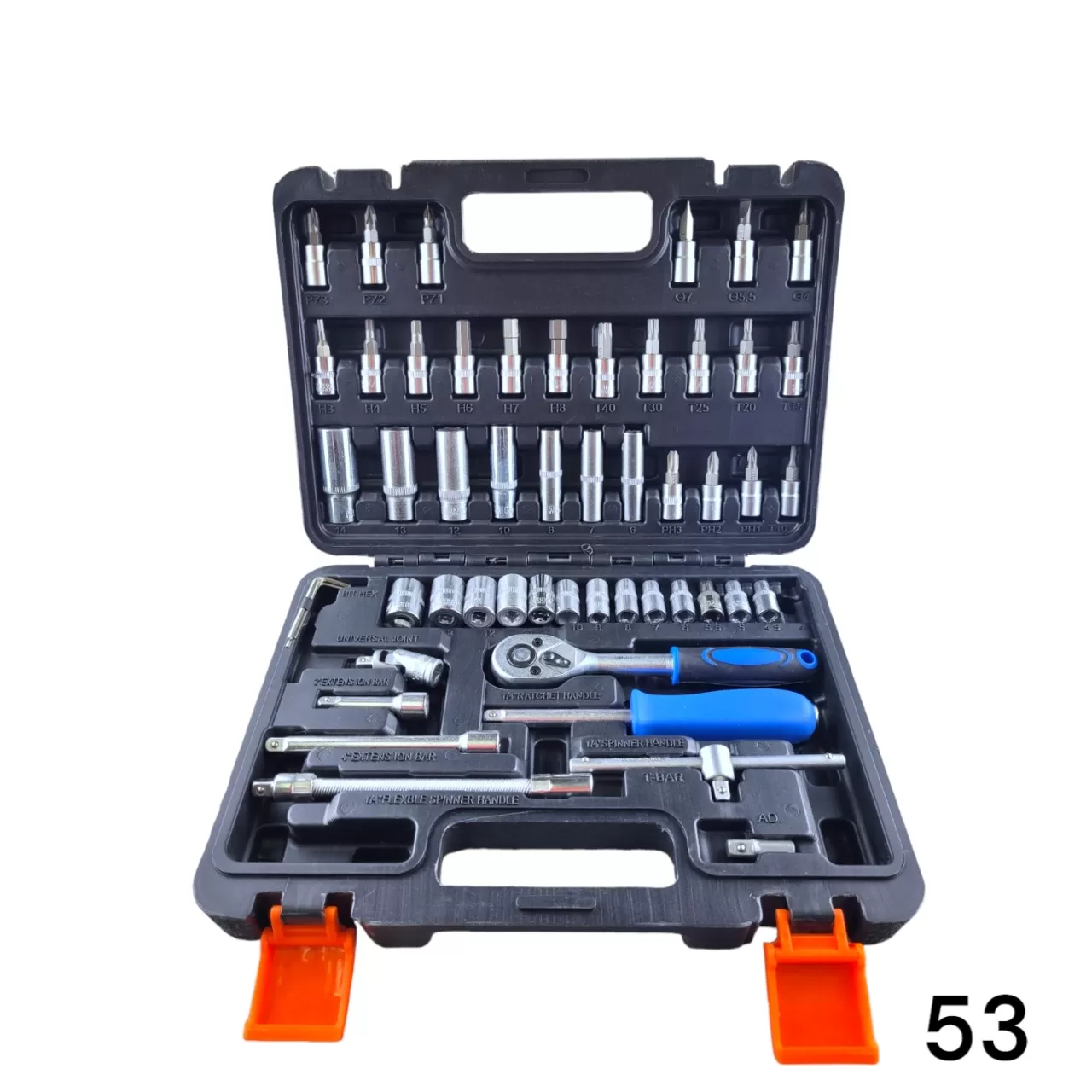 поставляется в жестком пластиковом кейсе для удобной транспортировки. В комплекте отвертка с заменяемыми битами, удлинитель, трещотка и вороток. Торцевые головки представлены ходовыми размерами от 4 мм до 14 мм. Место для каждого элемента подписано, а детали набора промаркированы. Трещотка с обратным реверсом дополнена удобной двухкомпонентной рукояткой.