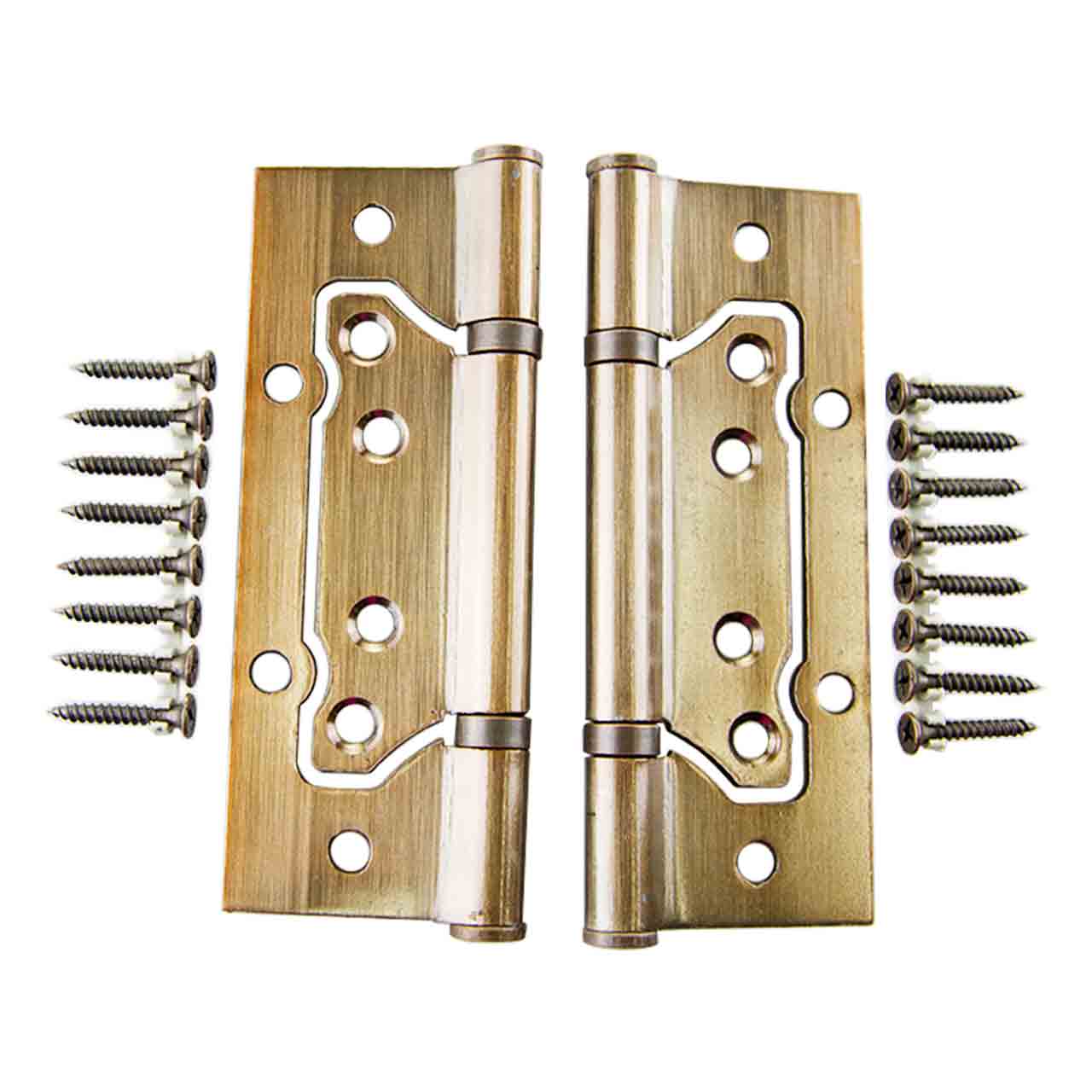 Универсальная накладная дверная петля цвета античной меди. В комплекте поставки входит — петля универсальная накладная, шурупы в цвет петли.